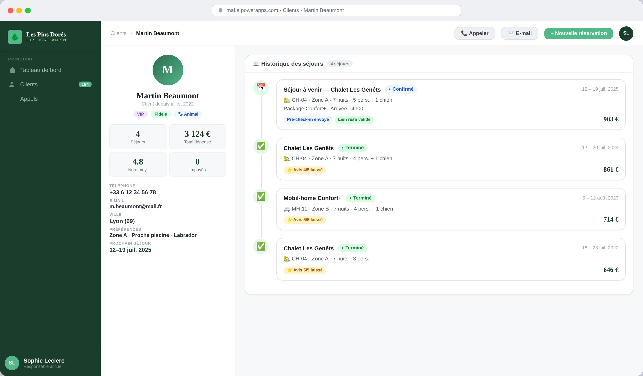 Pour être plus réactif et précis dans les réponses lors d’appels téléphoniques clients, le camping a mis à disposition de la relation client une application qui leur permet de consulter facilement les données de chaque établissement et bungalow. Grâce à ça, ils peuvent rechercher très rapidement une information et donner une réponse aux clients efficacement.