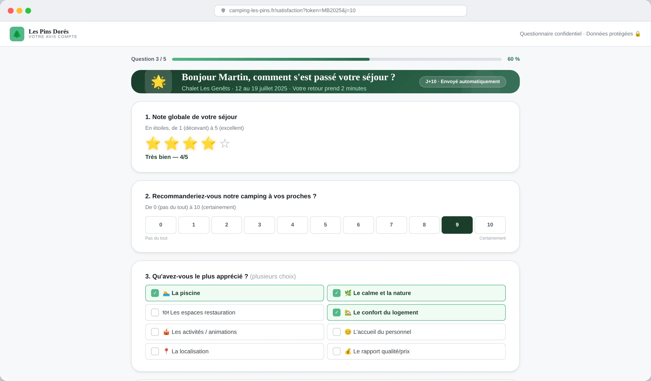 6 mois plus tard, Jérémy repense à ces super vacances. Il reçoit un mail de satisfaction de la part de l’équipe des Pins dorés avec un questionnaire très complet à remplir. Grâce à son retour, le camping est en constante amélioration.